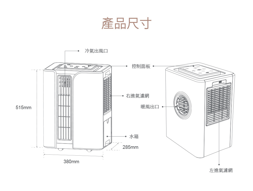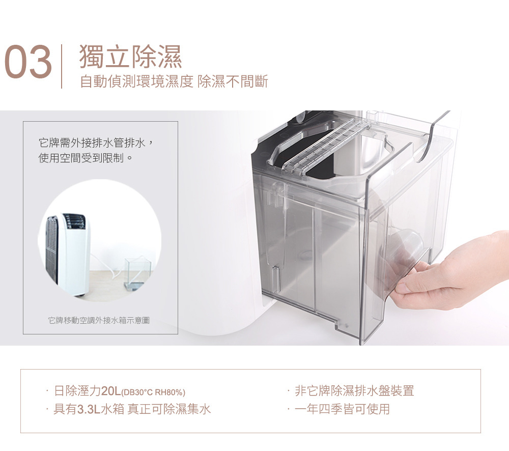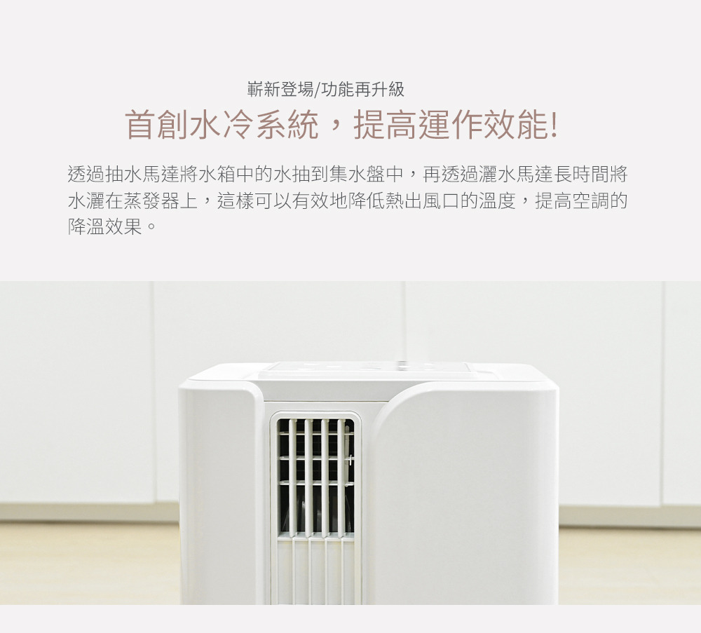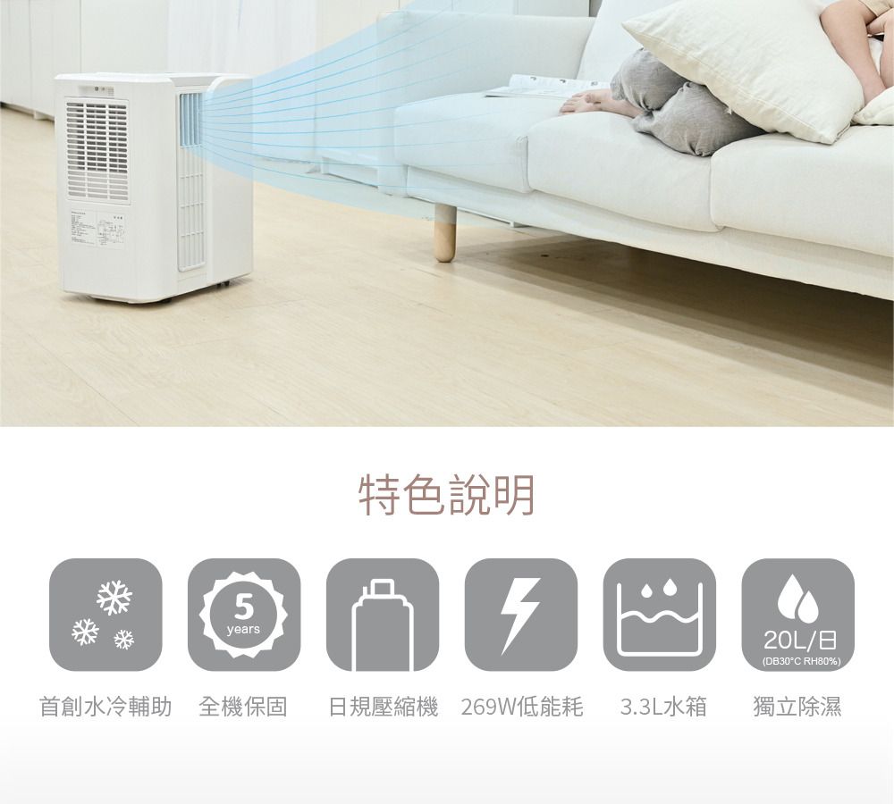 首創水冷輔助 雙側進風,加倍涼爽 日規壓縮機,269W低能耗 20L/日除濕力